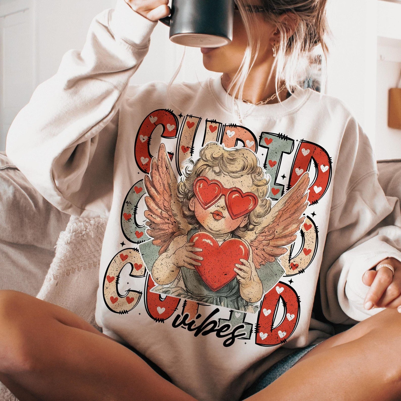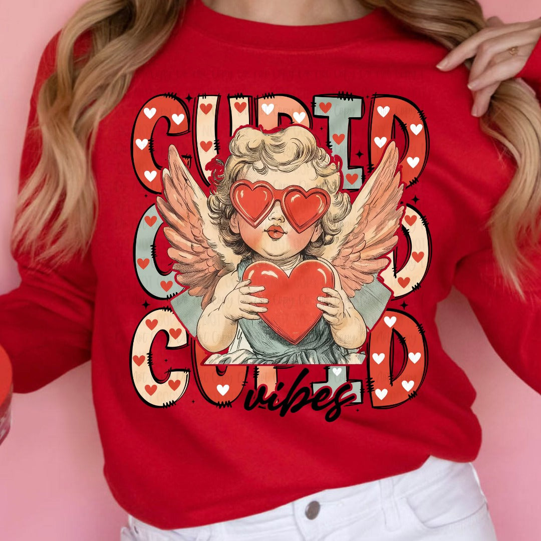 Elevate your Valentines Day outfit with the CUPID VIBES sweatshirt. Stay cozy and stylish with this must-have piece. Made with high-quality materials, this sweatshirt is the perfect way to show off your love for the season. Get yours now and spread the love!