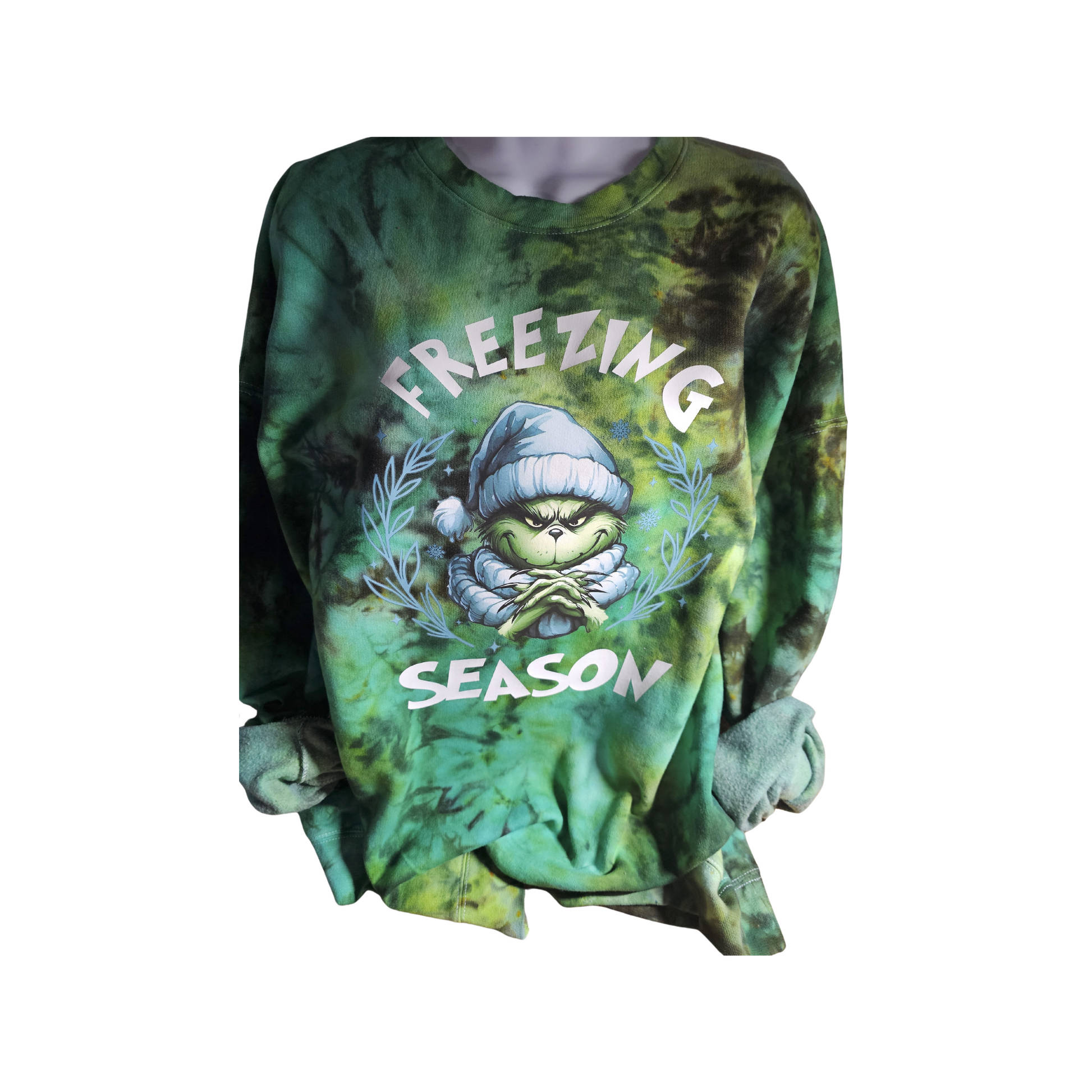 Stay cozy and stylish this holiday season with our TIE DYE GRINCH FREEZING SWEATSHIRT. Professional dyes ensure a vibrant and long-lasting color, while the soft material guarantees comfort. Perfect for spreading holiday cheer with a fashionable twist.