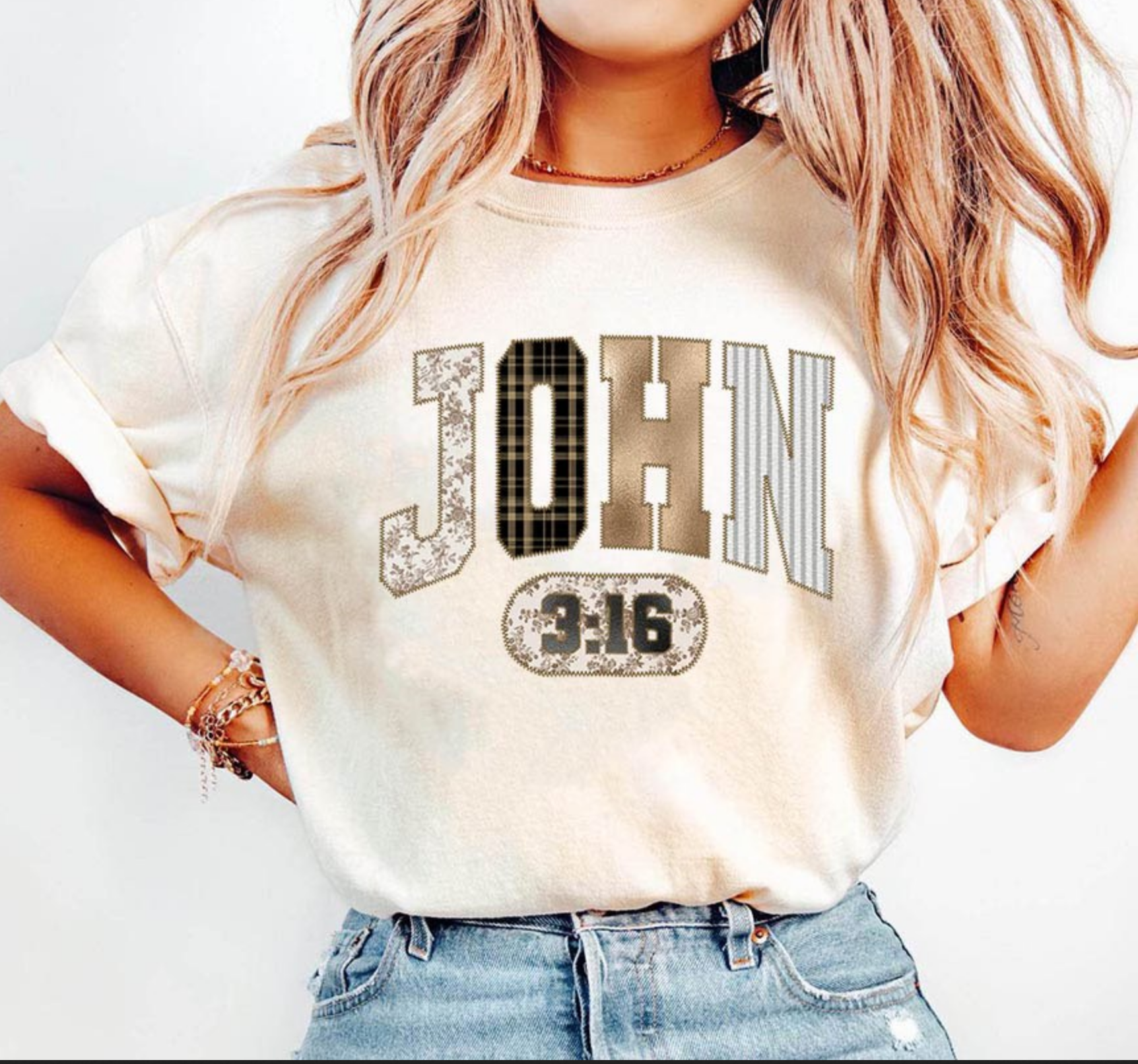 - Unisex sizing (S–2X) - Soft cotton/poly blend - Beige tee with varsity-style John 3:16 design - Perfect for faith-based gifts, church, and casual wear